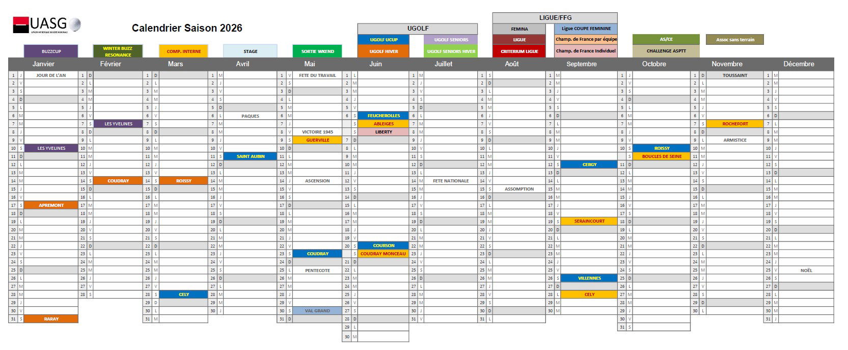 Chers abonnés à notre section UASG GOLF, j'ai le plaisir de vous proposer à travers ce premier calendrier 2026 les événements pour l'année 2026 connus à ce jour afin que vous puissiez avoir une première vision des différentes compétitions internes, corpo etc, stages, week-end de notre section. Nous mettrons à jour celui-ci au fur et à mesure de la confirmation des événements.